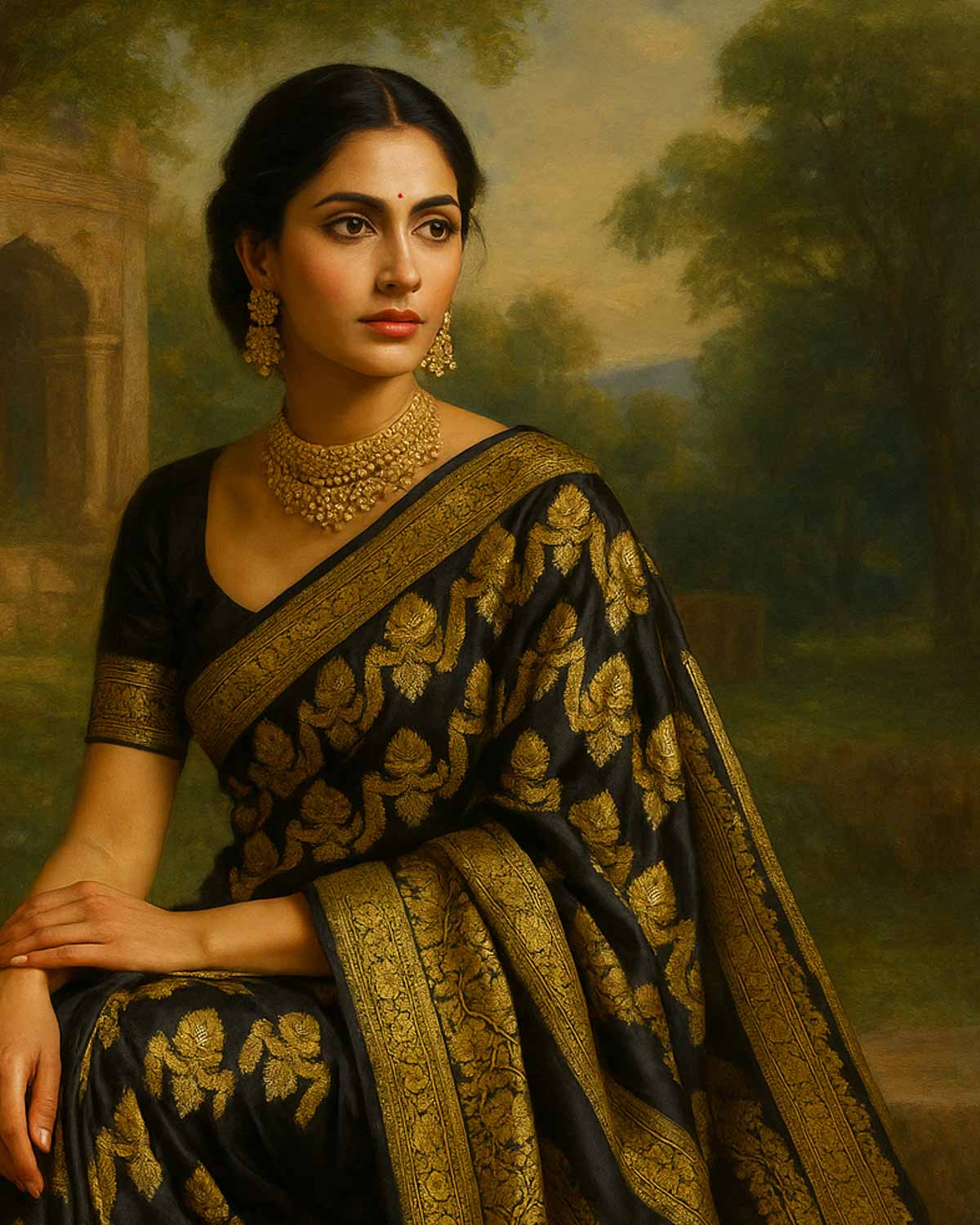 Sold outSave 31%Black Banarasi Tehri Paisley Jamawar Brocade Handwoven Katan Silk Saree with Gold Zari Accents-HolyWeavesBlack Banarasi Tehri Paisley Jamawar Brocade Handwoven Katan Silk Saree with Gold Zari Accents-HolyWeaves