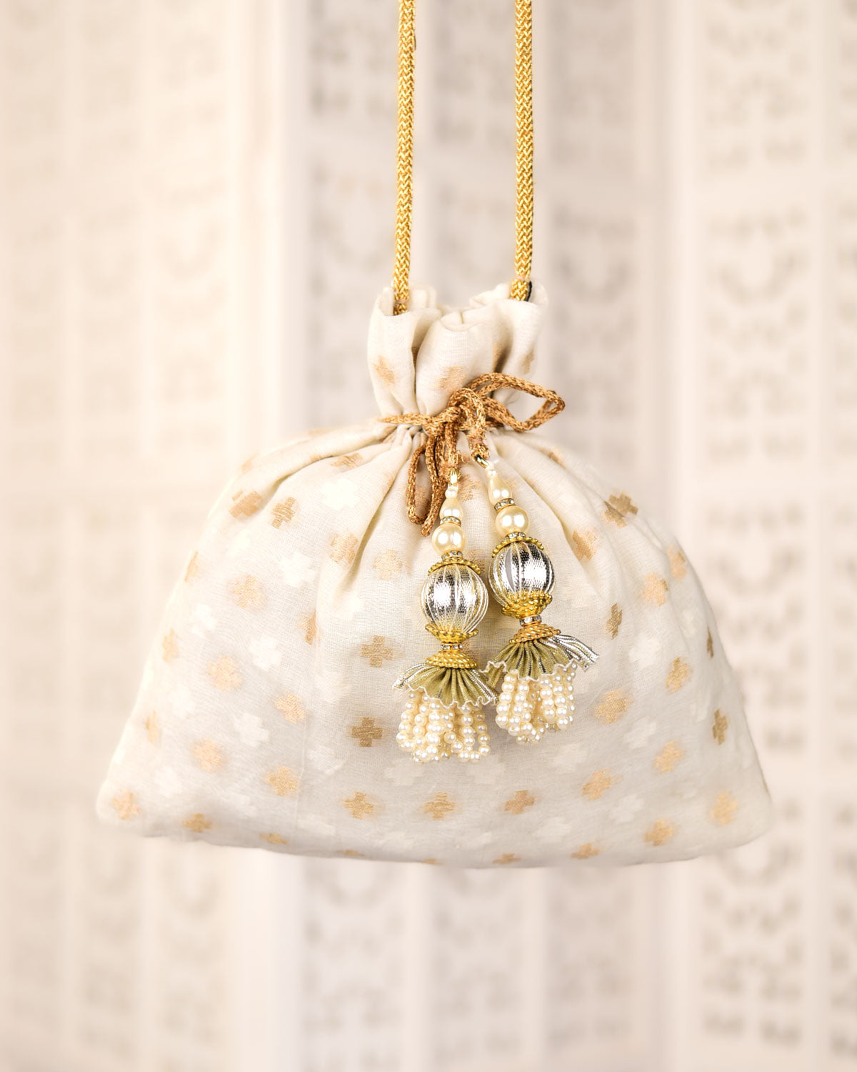 Save 25%Cream Banarasi Gold & Resham Zari Cutwork Brocade Handwoven Cotton Silk Potli 10.5"x10"-HolyWeaves