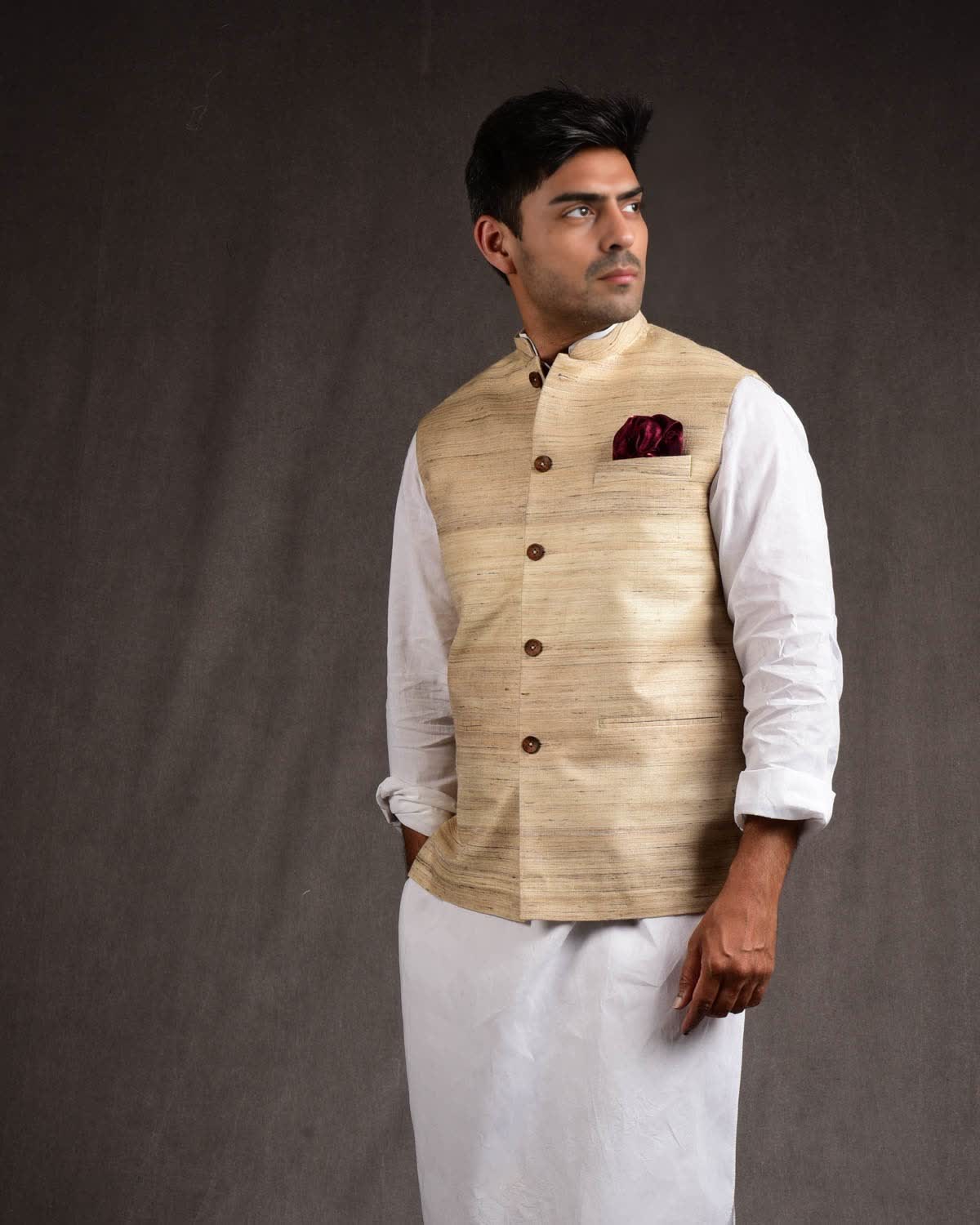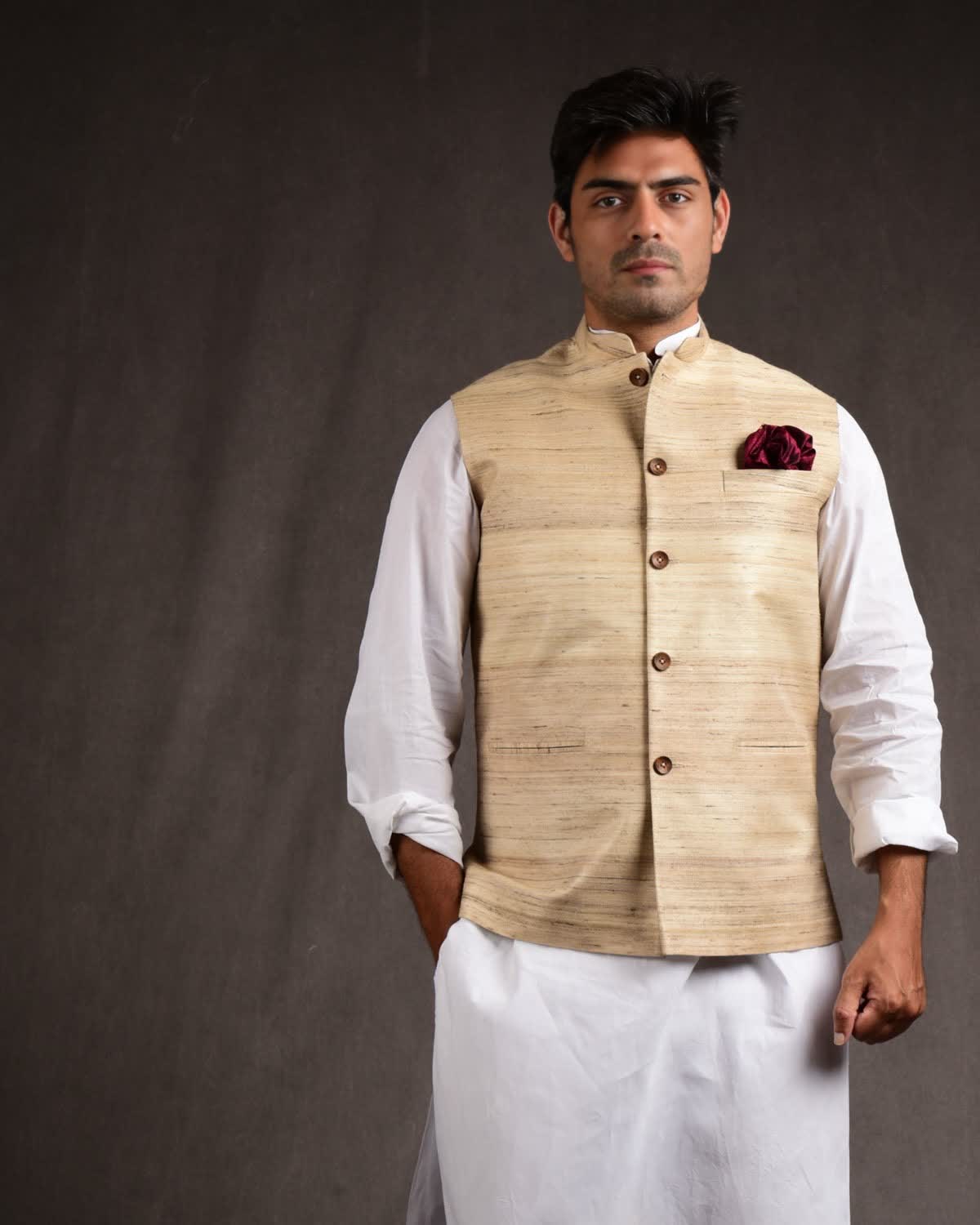 Save 30%Textured Beige Tasar Khichha Mens Modi Jacket-HolyWeavesTextured Beige Tasar Khichha Mens Modi Jacket-HolyWeaves