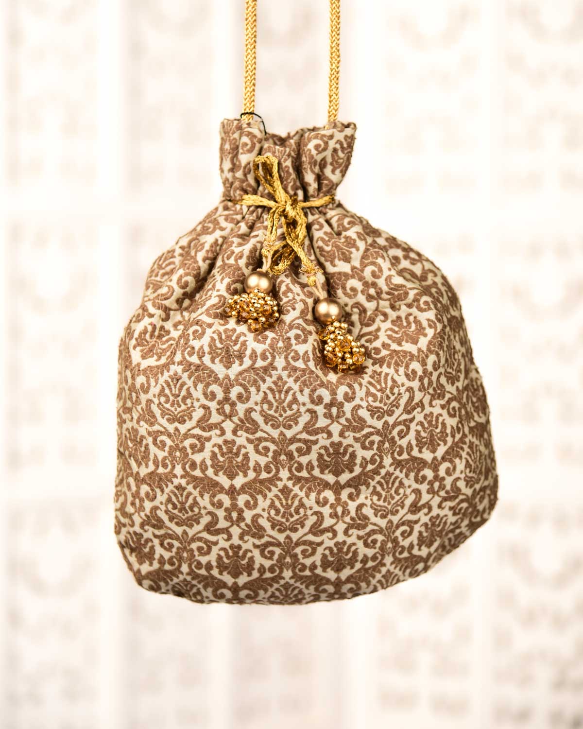 Beige Banarasi Damask Tanchoi Handwoven Cotton Potli 11"x10" Offer Price: ₹1,495.00 INR Regular Price: ₹2,590.00 INR