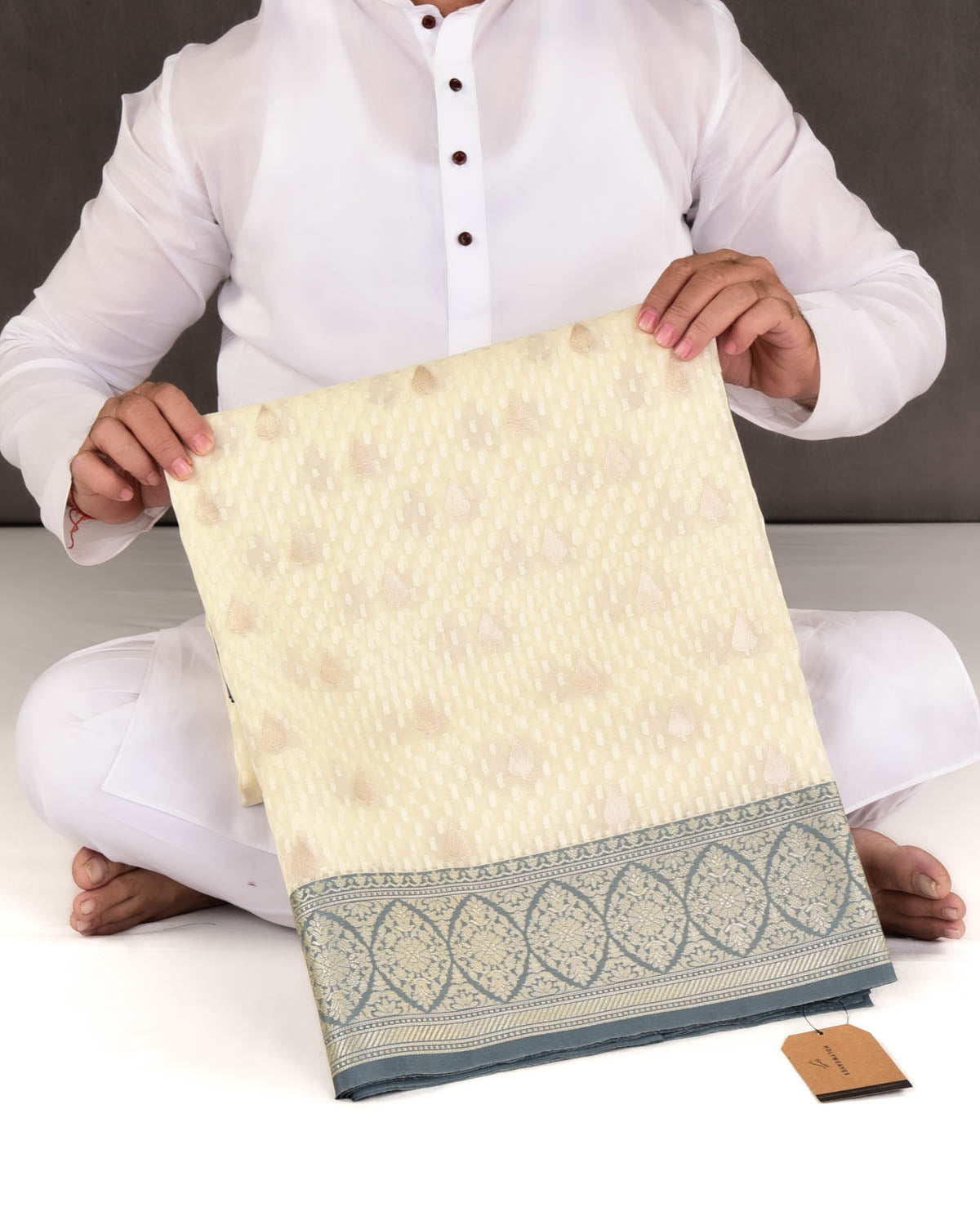 Save 32%Ivory White Gold Zari Buti Cutwork Brocade Woven Dupion Silk Banarasi Saree with Meenekari Buta-HolyWeavesIvory White Gold Zari Buti Cutwork Brocade Woven Dupion Silk Banarasi Saree with Meenekari Buta-HolyWeaves