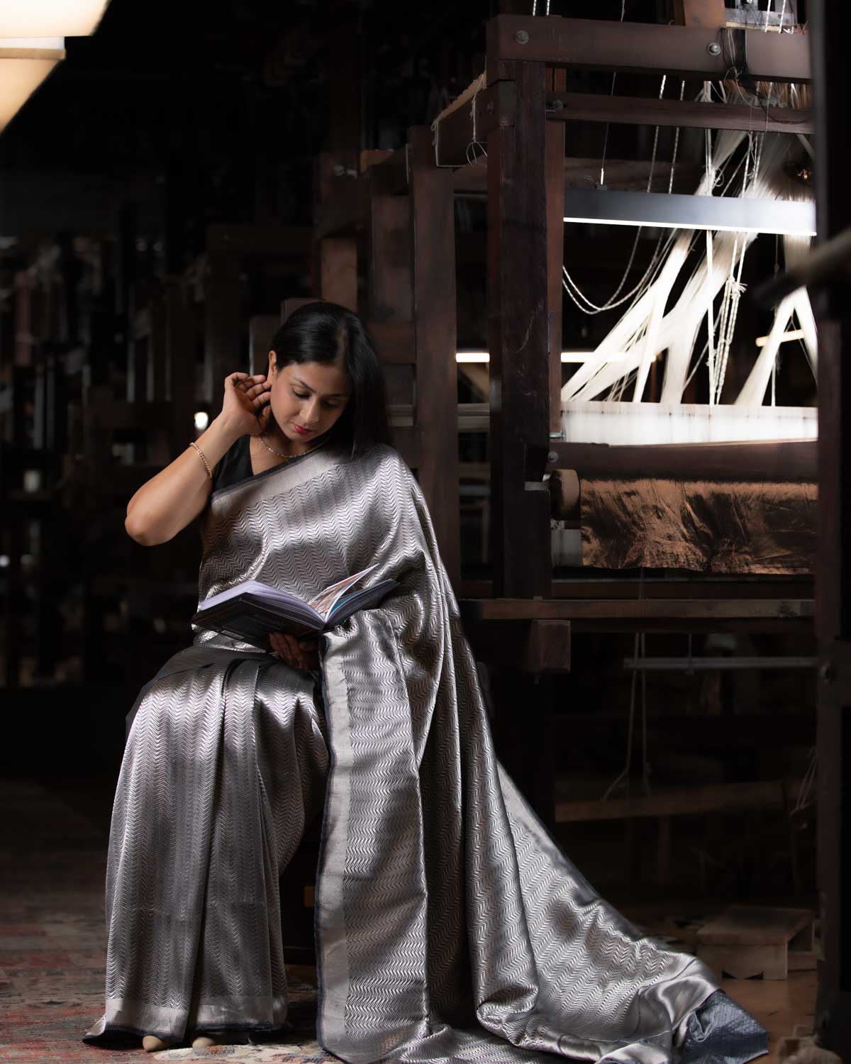 Save 29%Metallic Silver Gray Illusion Brocade Handwoven Tissue Banarasi Saree-HolyWeavesMetallic Silver Gray Illusion Brocade Handwoven Tissue Banarasi Saree-HolyWeaves