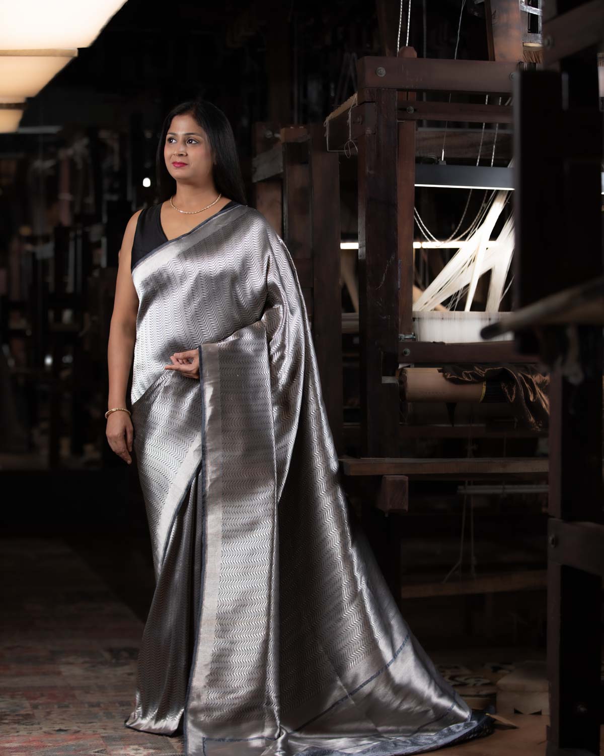 Metallic Silver Gray Illusion Brocade Handwoven Tissue Banarasi Saree Offer Price: ₹27,695.00 INR Regular Price: ₹38,790.00 INR