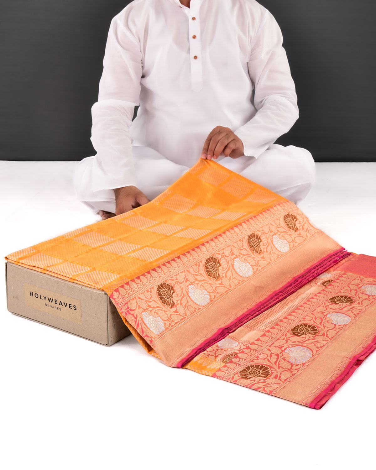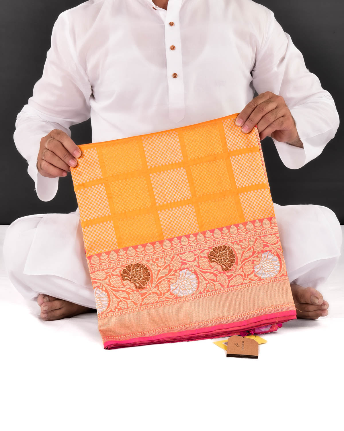 Save 30%Shot Orange Cross Stitch Jaal Satin Tanchoi Brocade Handwoven Katan Silk Banarasi Saree with Gold Zari Accents-HolyWeavesShot Orange Cross Stitch Jaal Satin Tanchoi Brocade Handwoven Katan Silk Banarasi Saree with Gold Zari Accents-HolyWeaves