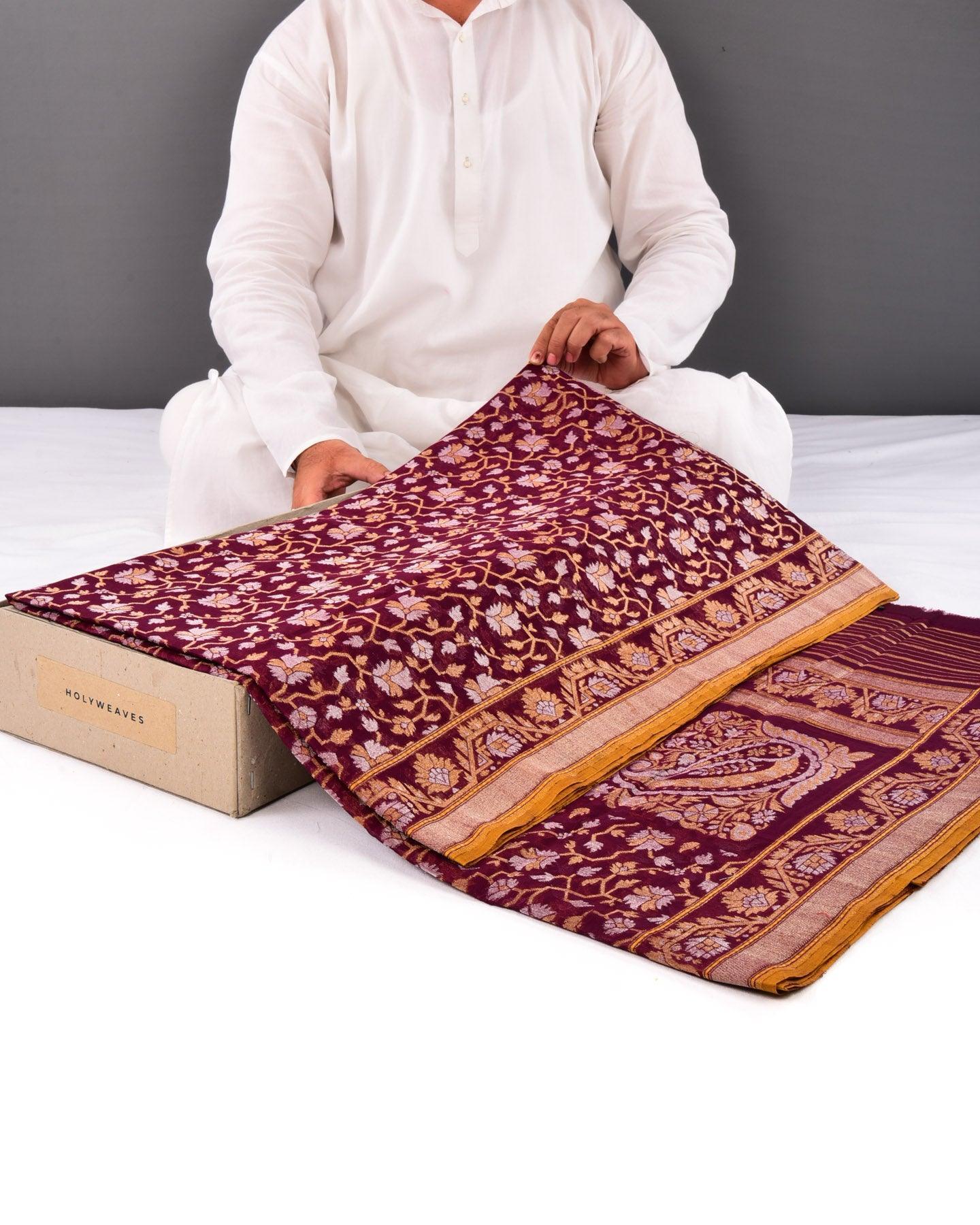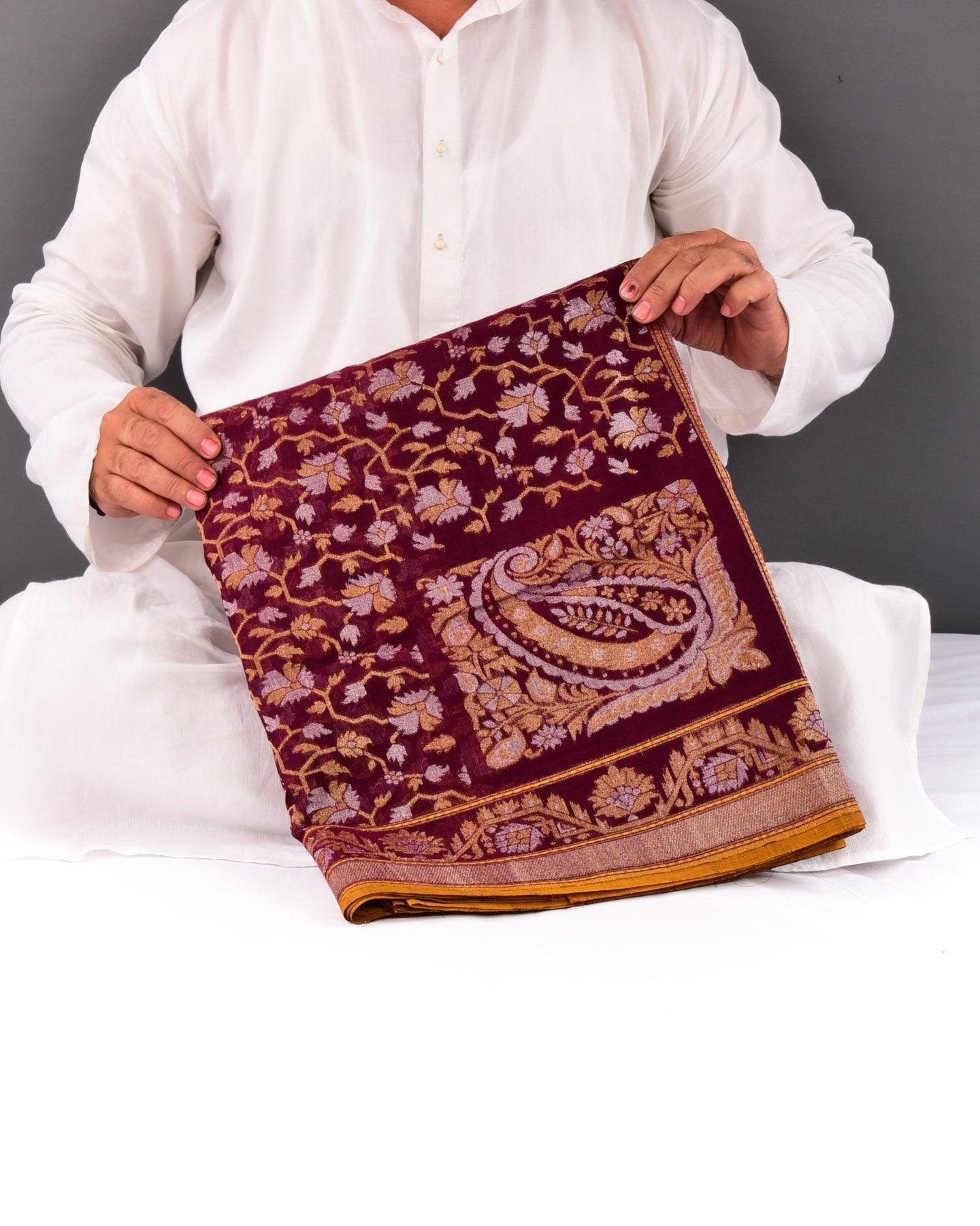 Burgundy Rose Gold Zari Gulab Jaal Cutwork Brocade Handwoven Khaddi Georgette Banarasi Saree Offer Price: ₹15,495.00 INR Regular Price: ₹22,190.00 INR