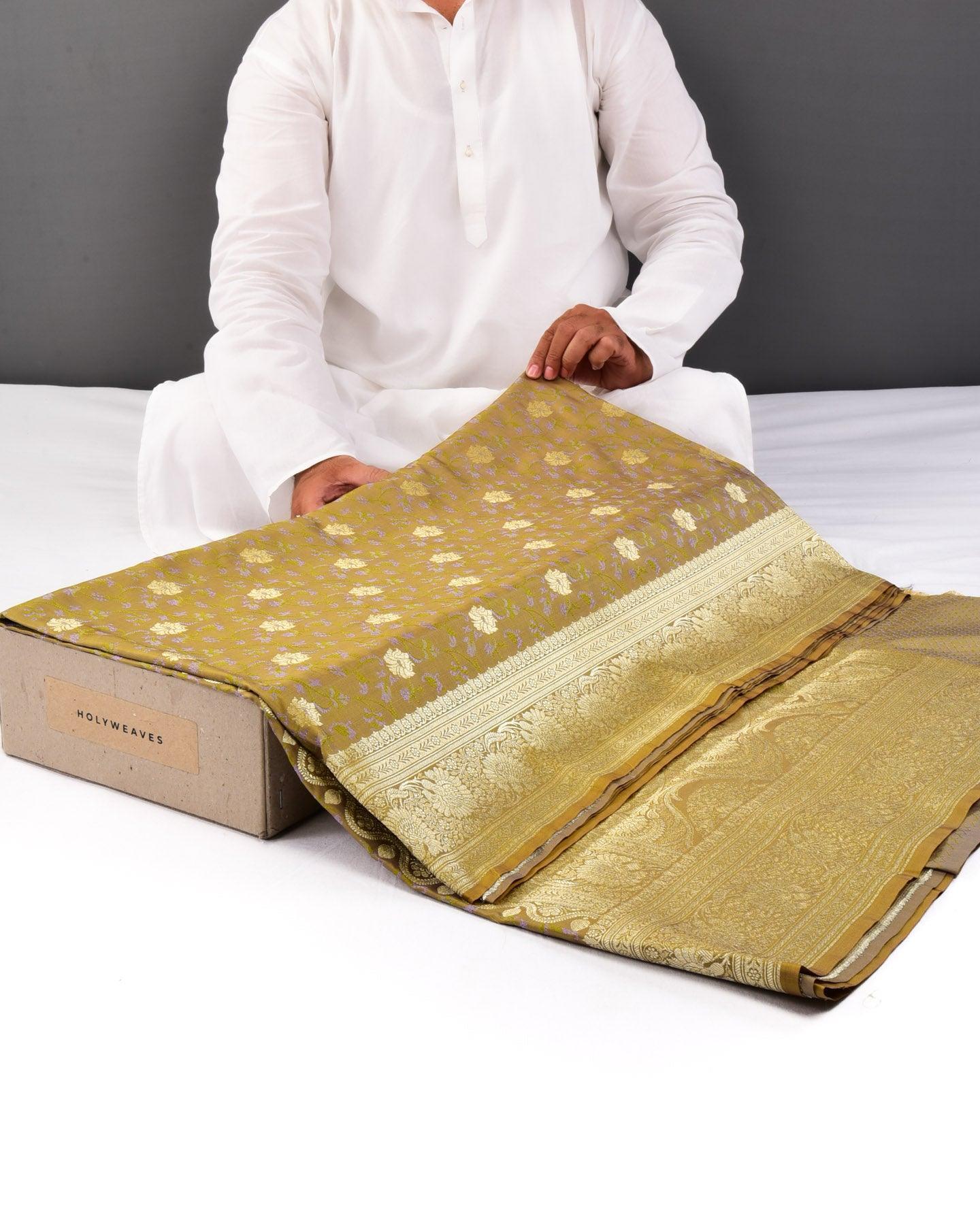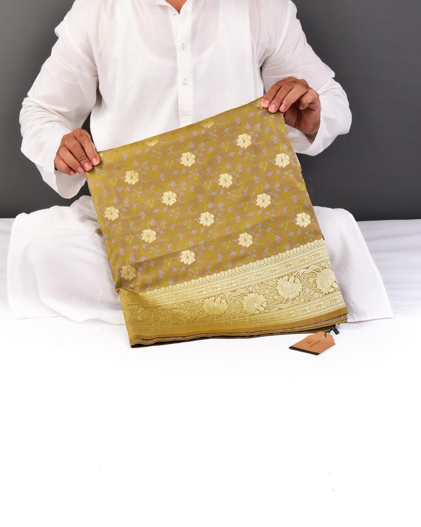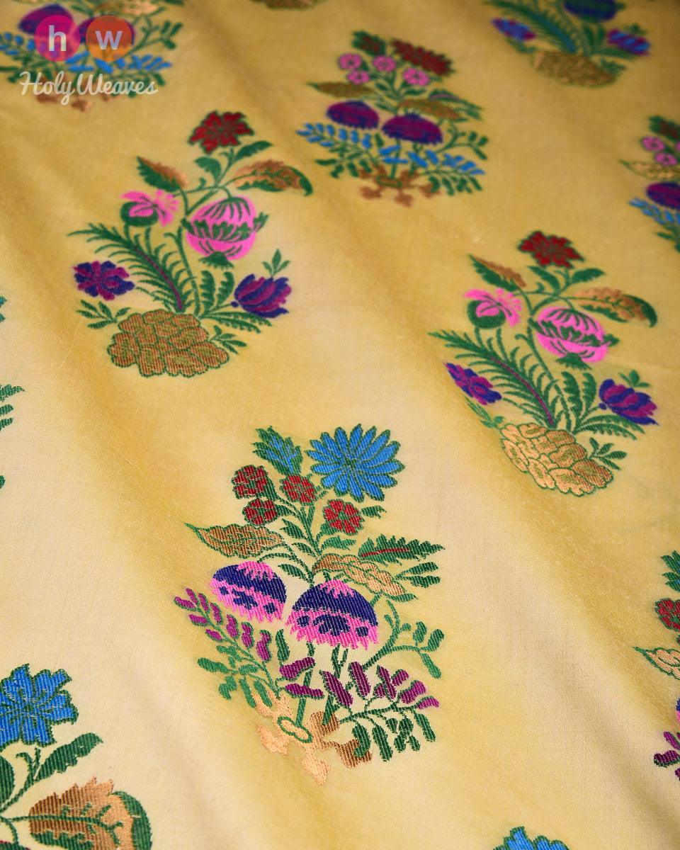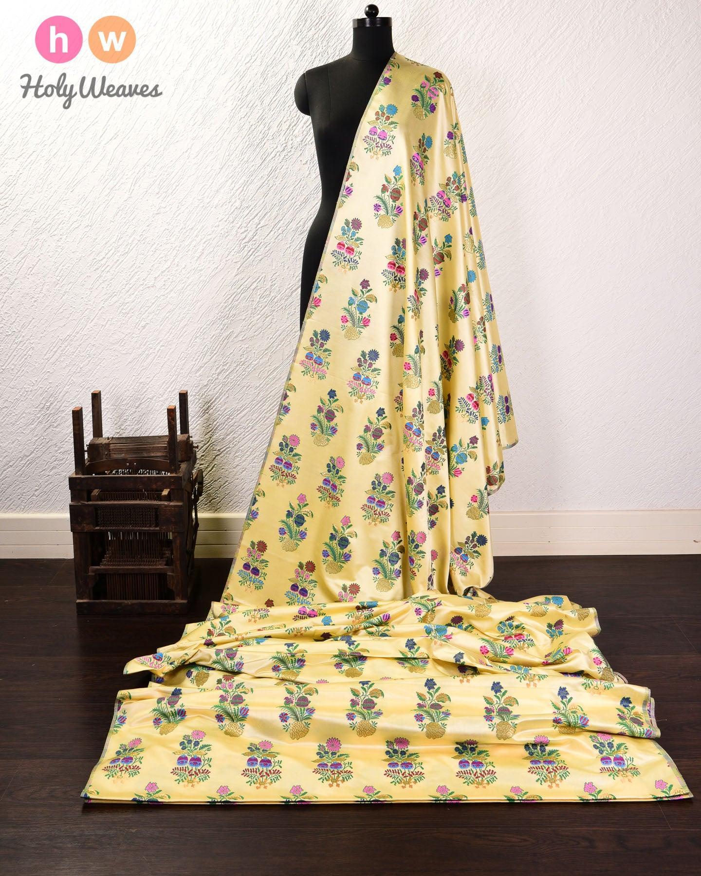 Save 41%Beige Banarasi Antique Resham Buta Jaal Tanchoi Handwoven Cotton Potli with Side Golden Lace 11"x10"-HolyWeaves