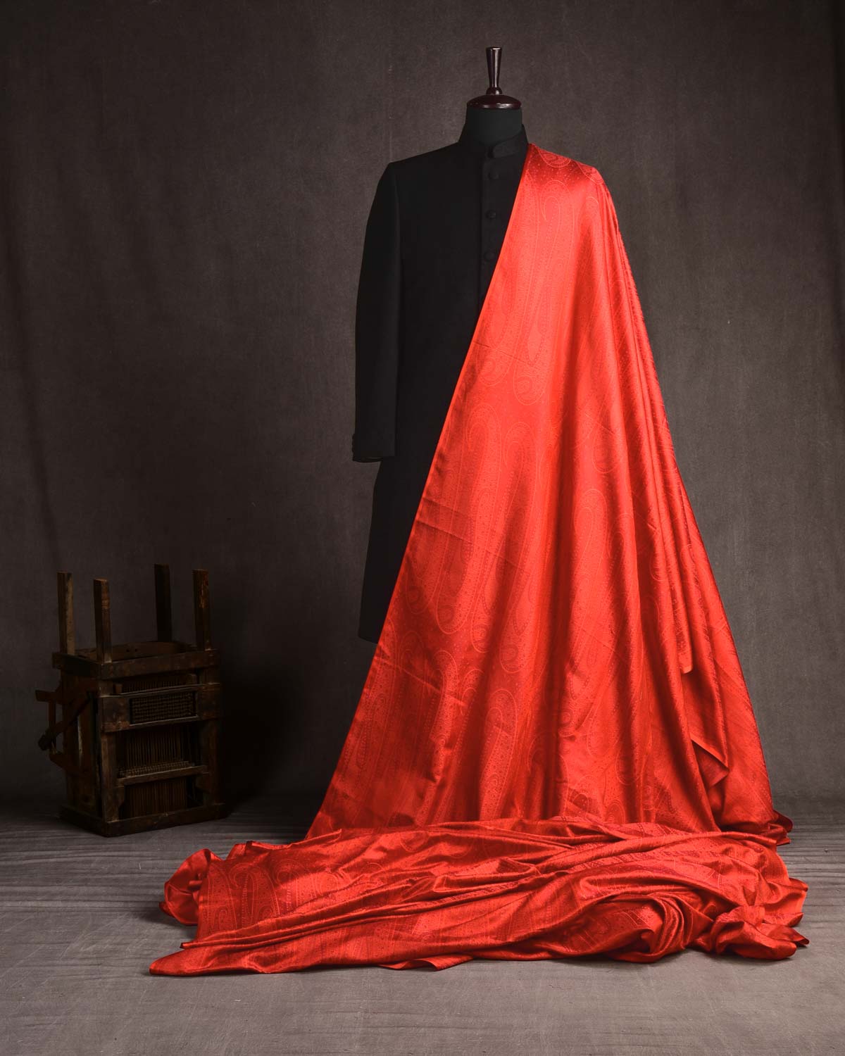 Rich, bold, and unmistakably regal, this high-density satin silk fabric in deep red features a grand layout of large paisleys woven in the luxurious tehra style—a time-intensive process using three-color yarns for nuanced shading. The weave is dense and fluid, with a satin finish that gleams without glare, making it ideal for garments of stature.