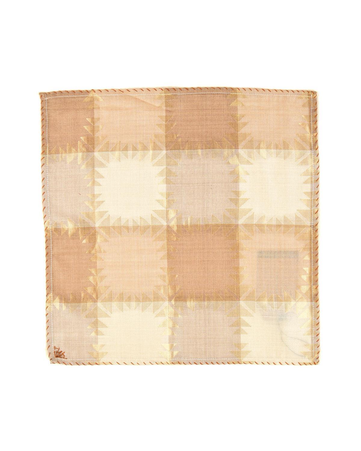 This handwoven Banarasi pocket square features a refined geometric kadhuan brocade in alternating cream and beige blocks, subtly illuminated with gold zari triangles. The layout creates a modern grid with a timeless ethos, making it a versatile accent for minimalist wardrobes or heritage ensembles. Its balance of geometry and elegance comes alive in shell or layered folds.