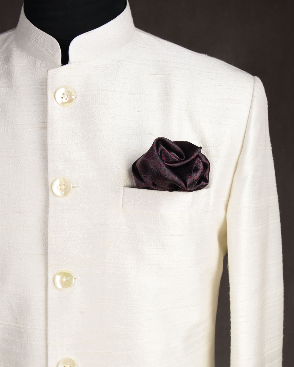 Understated yet distinctive, this handwoven silk pocket square showcases a geometric chequered Tanchoi weave in plum on charcoal. The pattern reveals subtle contrast and depth as you fold—ideal for rose, puff, or layered wave folds. The woven design creates a sculpted presence that sets it apart from printed alternatives.