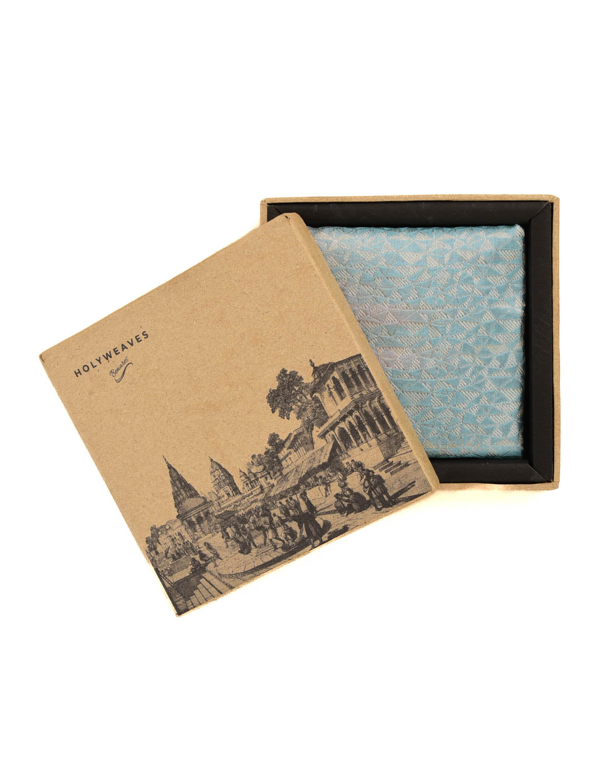 Cool-toned and contemporary, this pocket square weaves together dove gray, icy blue, and glints of silver and gold in a geometric triangle lattice. The subtle ombré background and tonal zari shimmer give it quiet depth—perfect for folds like the crown, puff, or shell, where pattern and sheen come alive.