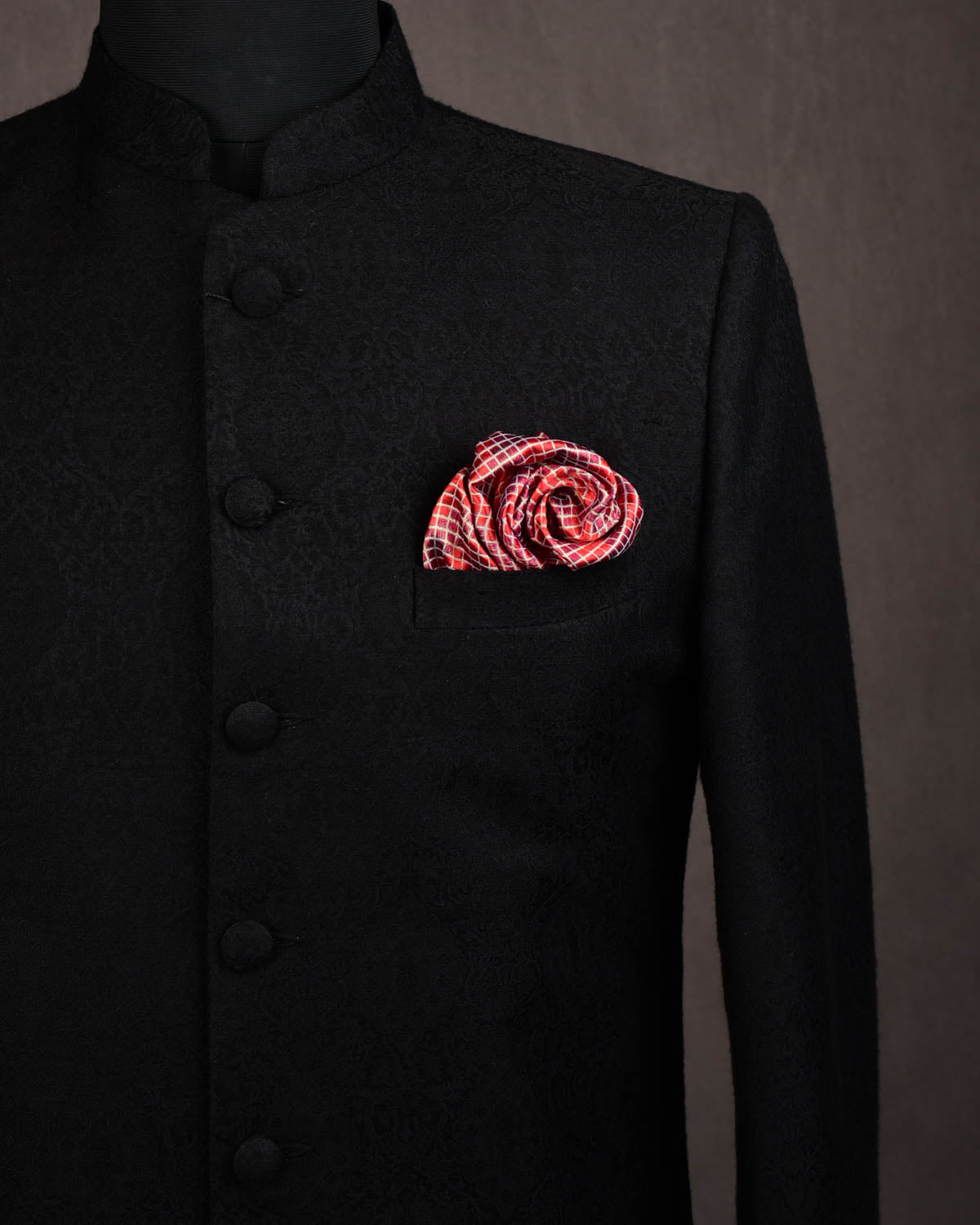 Finished with a double hem—machine stitched and hand-sewn—this piece stands out beautifully against black bandhgalas, navy tuxedos, or even charcoal linen jackets. An effortless accent for receptions, art galas, or formal evenings with global flair.
