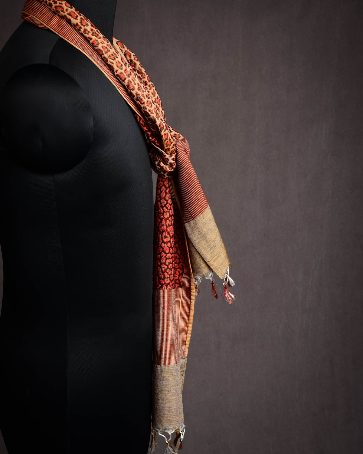 Unapologetically bold yet richly artisanal, this striking scarf juxtaposes a fierce leopard motif with the subtle sheen of fine Banarasi weaving. Rendered in earthy tones of mustard, rust, and brown with deep crimson highlights, the animal-inspired pattern is softened by the luxurious handfeel of silk-wool. The tonal striped ends ground the design, adding an elegant counterbalance to the expressive body.