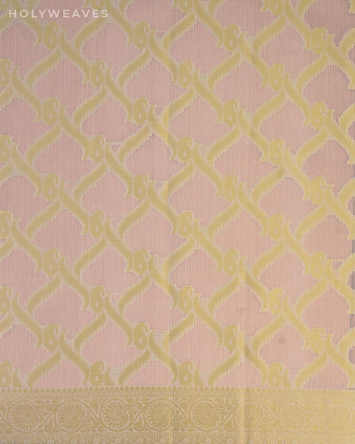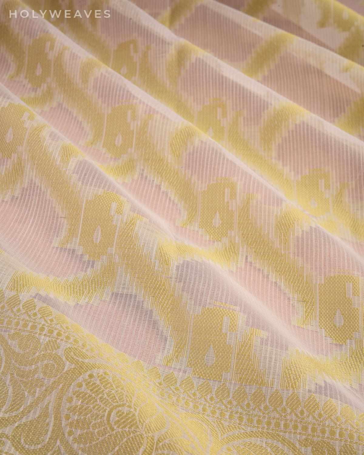 A delicate ivory-white base sets the stage for this charming Banarasi saree, woven in blended cotton silk. The fabric is adorned with a jaal of pale green resham vines. The weave has been executed in cutwork brocade technique, allowing the subtle pattern to breathe through the sheer texture of the drape.