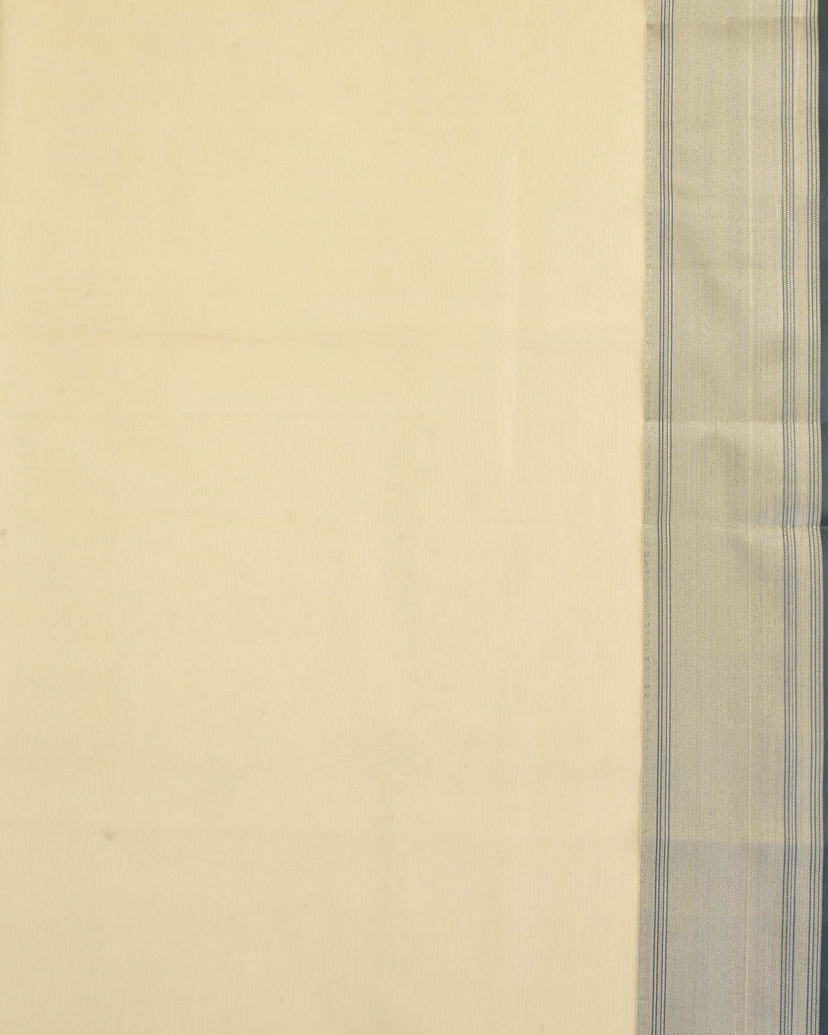 • Color: Cream body with grey border and pallu, gold zari, and white resham