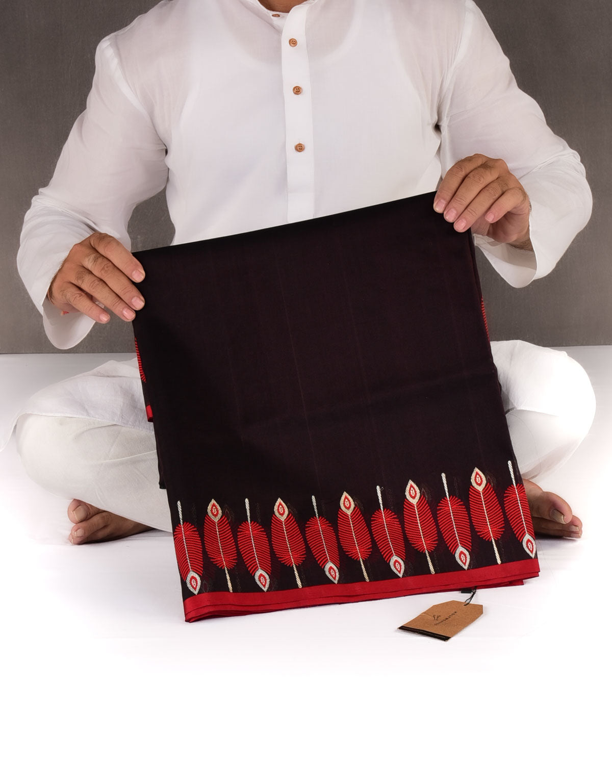 In a rich, close-to-black, midnight mahogany base, this handwoven Banarasi saree in pure kora silk features a striking red feather-inspired border. The body is kept minimal to let the border design take centre stage, while the kadhuan brocade weave lends structural clarity and an artisanal finish. The interplay of soft transparency and bold colour gives the saree a distinctive and modern character.
