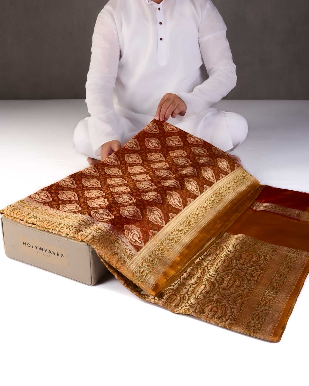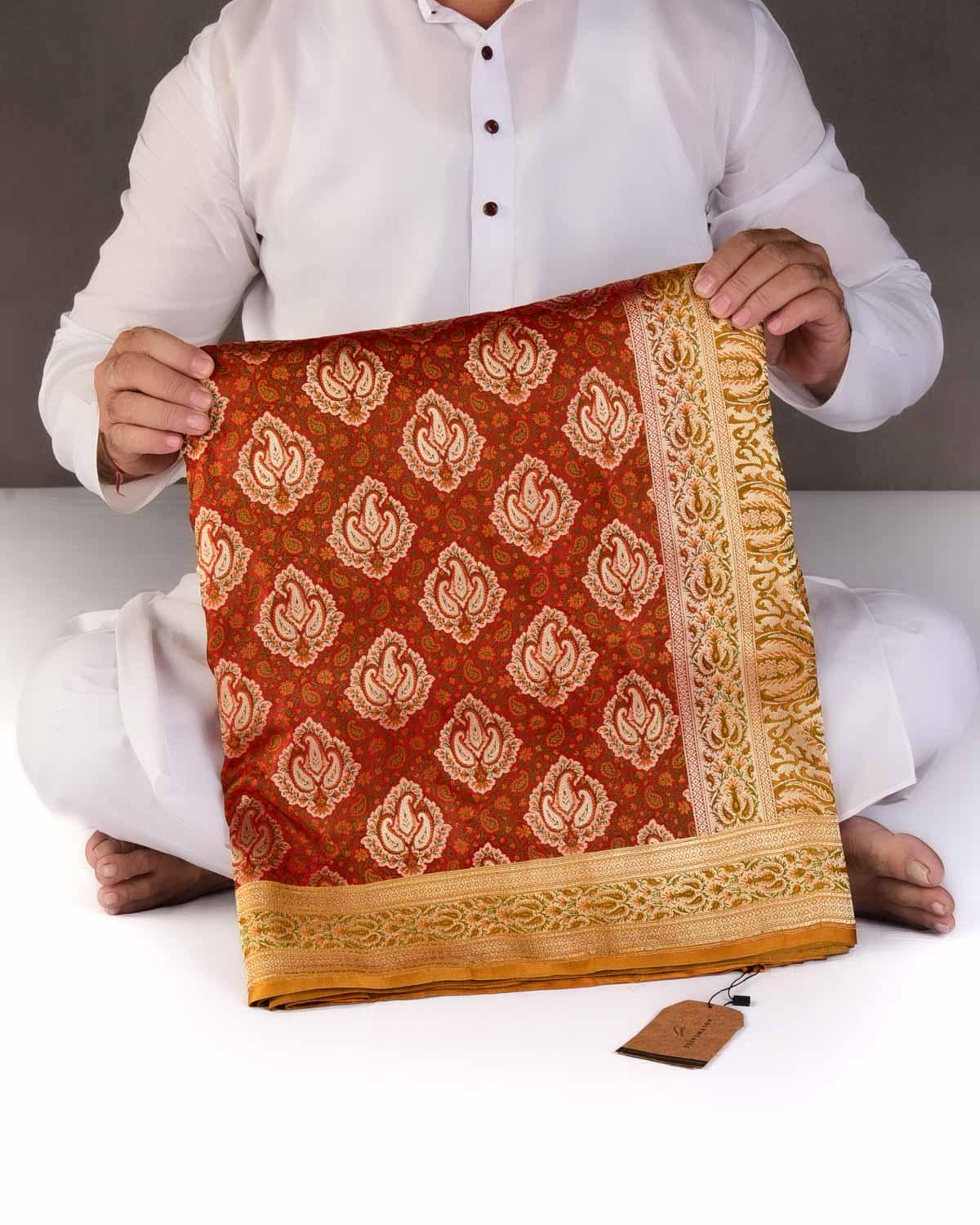 Bridal Red Banarasi Gold Zari & Resham Tehri Satin Jamawar Tanchoi Brocade Handwoven Katan Silk Saree with Contrast Border Pallu