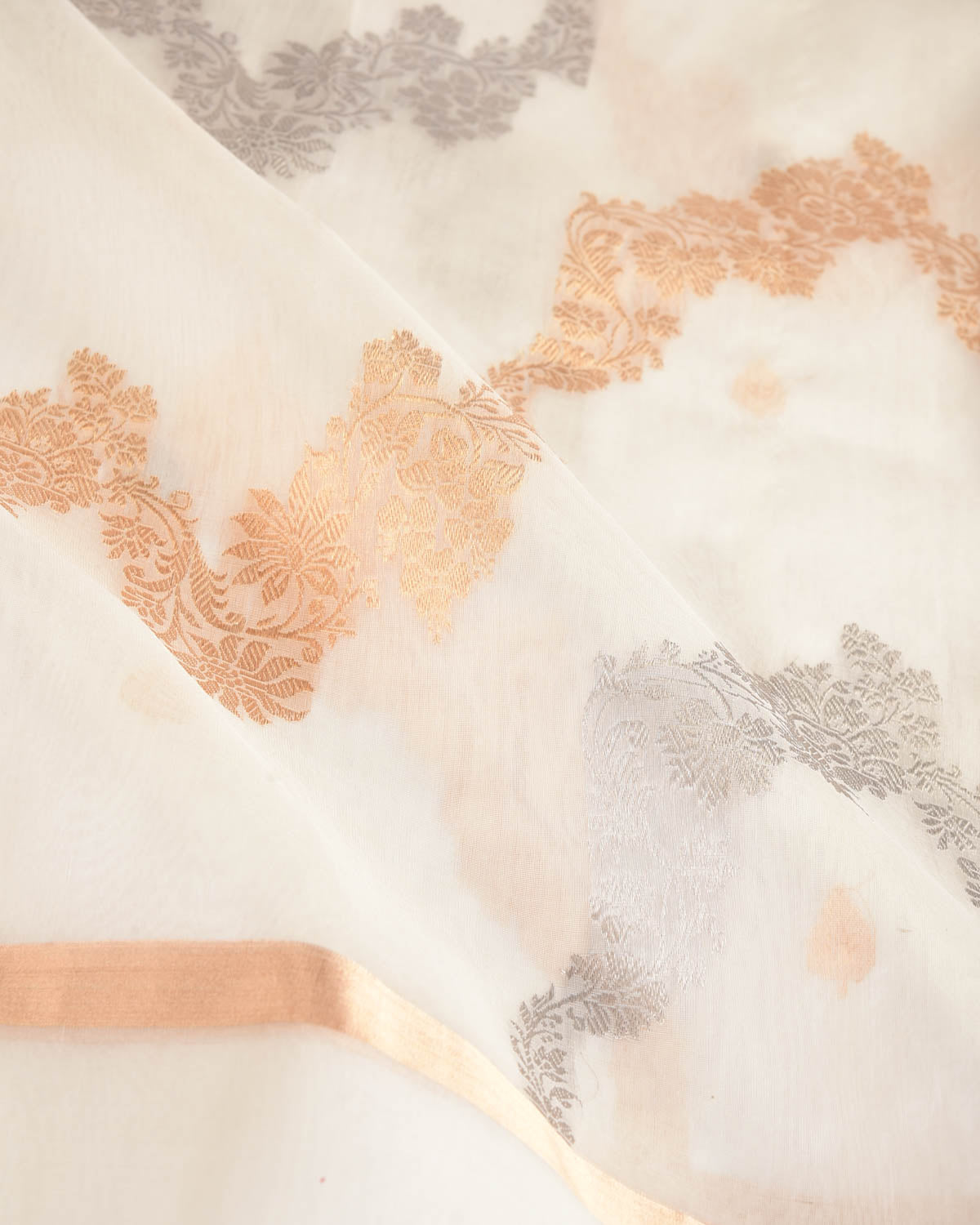Ivory White Gold & Silver Zari Bel Kadhuan Brocade Handwoven Kora Silk Banarasi Saree