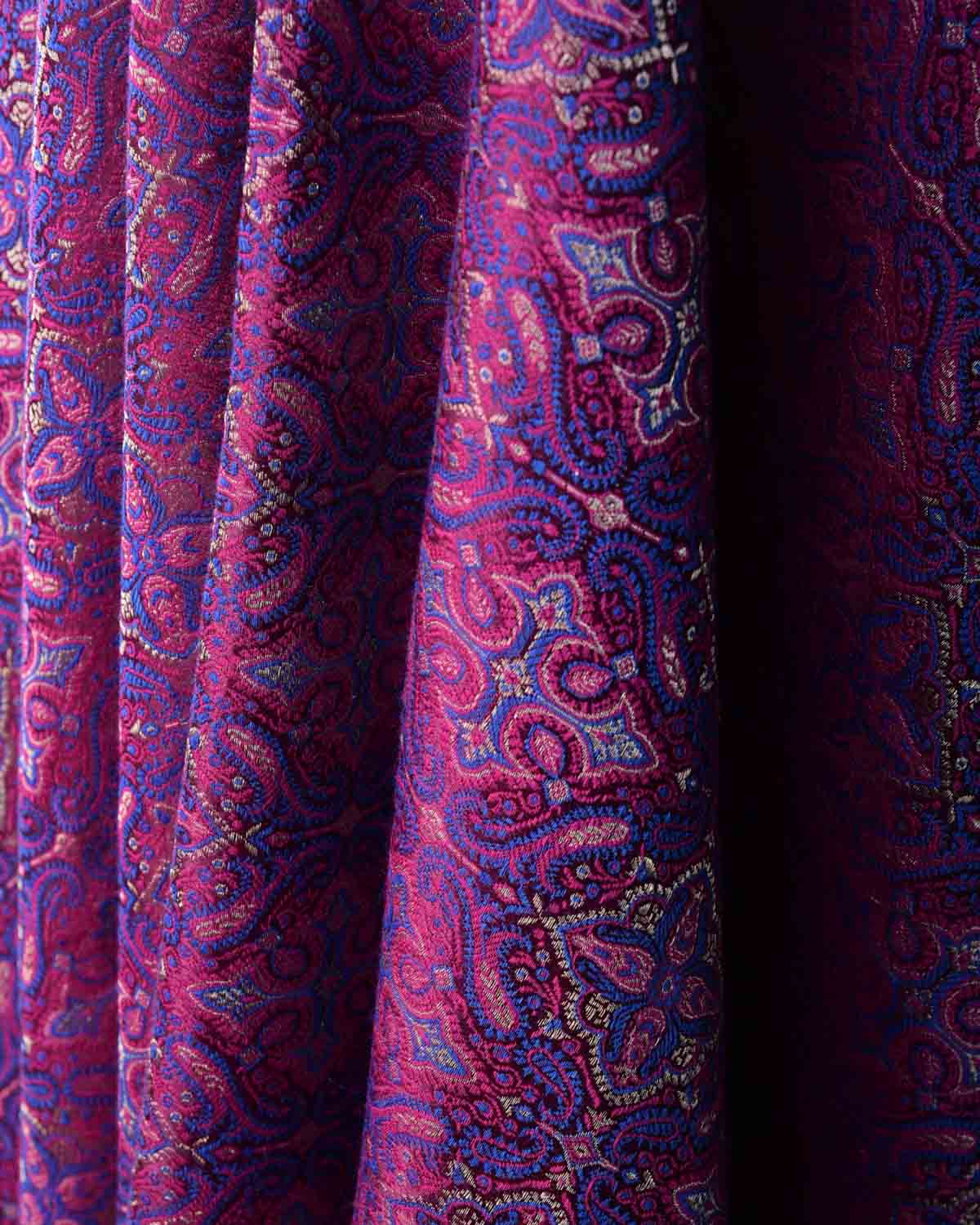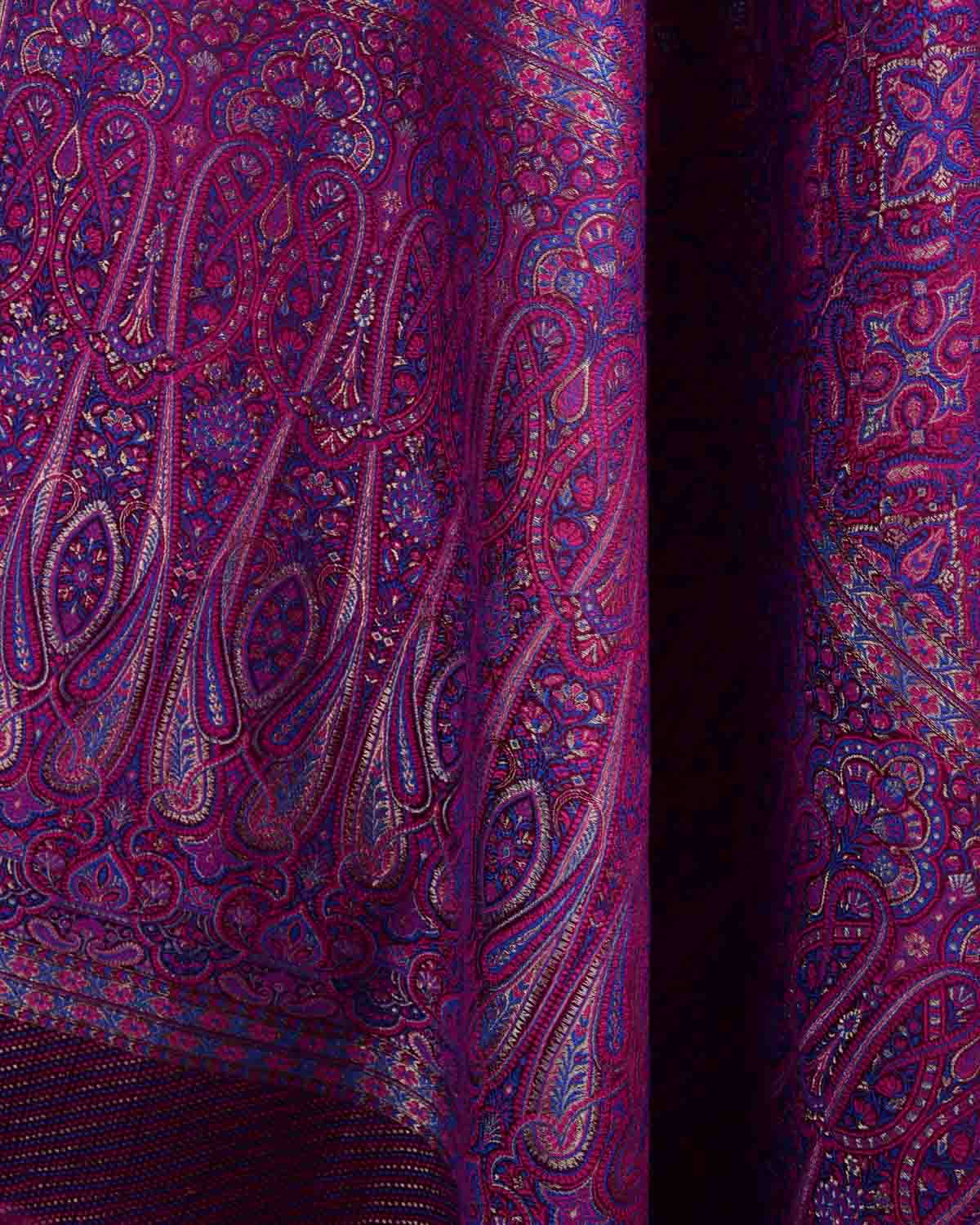 The color—a radiant fusion of royal purple and magenta—shifts with every fold, making it feel alive and ever-changing. Woven in our Banaras atelier using pure silk and fine wool, the fabric combines luxurious drape with comforting warmth. The matching selvedge completes the look with cohesive polish.